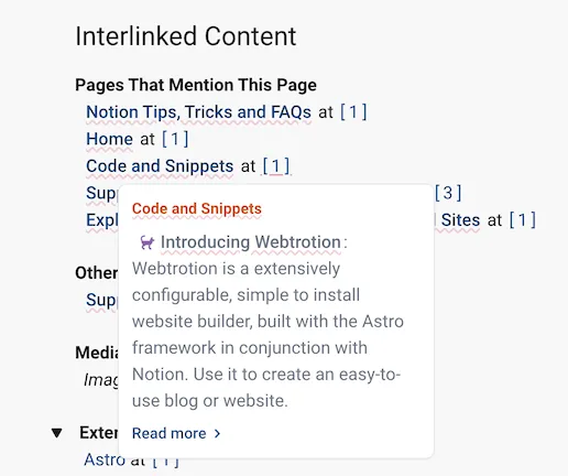 | references | To show related pages, external links, and mentioned media at the end of the post. Set popovers to true to display a snippet when hovering over a post link in the body. |
