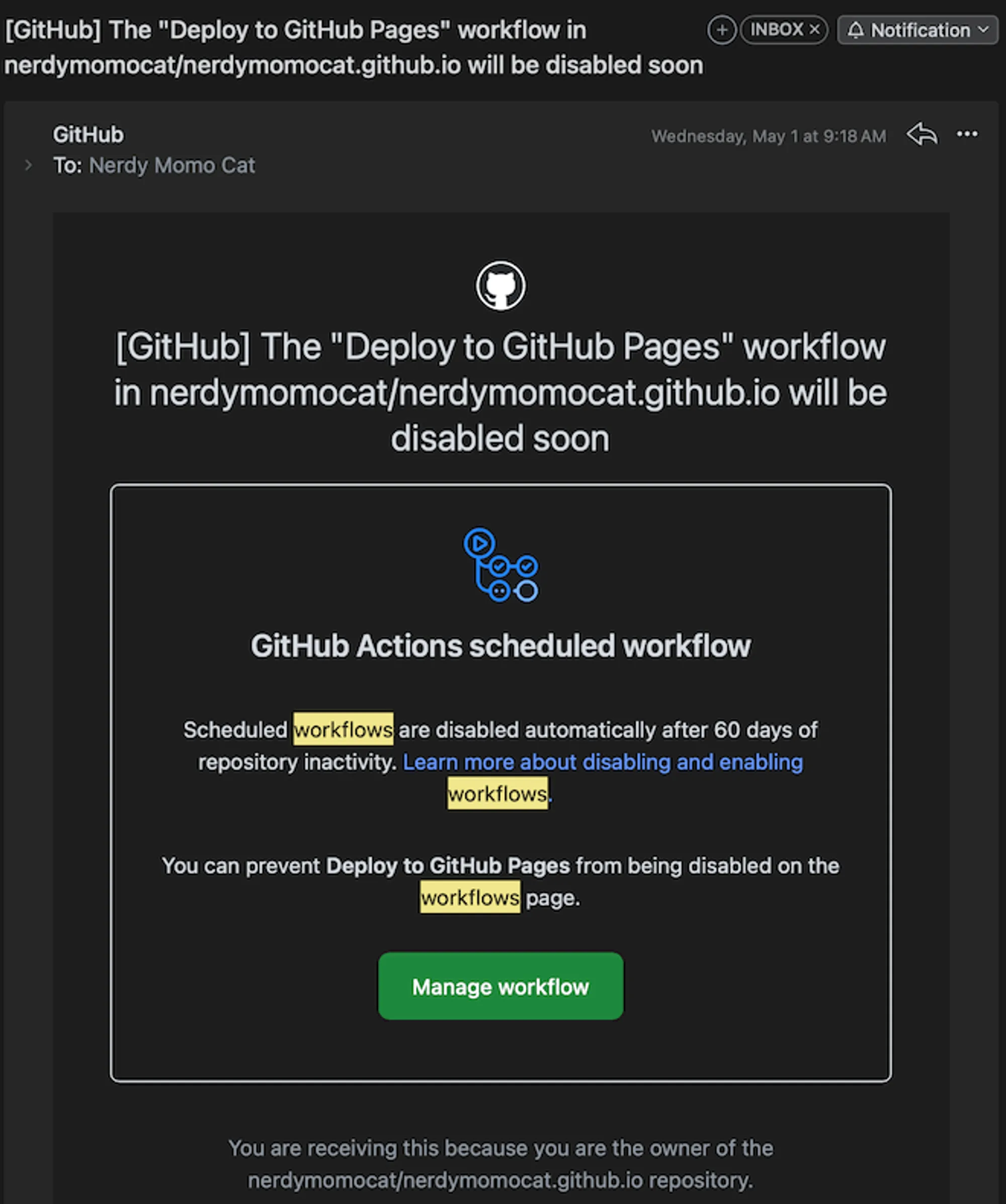 ![[GitHub] The "Deploy to GitHub Pages" workflow in nerdymomocat/nerdymomocat.github.io will be disabled soon](/notion/6c6e8f96-a269-4eab-8cdc-b123194509d7/Untitled.webp)